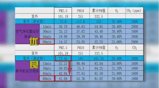 新風係統測試結果 通過實驗證明,同樣的淨化設備,室內空氣淨化機淨化力度要比新風係統強,在同樣的環境裏,空氣淨化器能將室內的PM2.5濃度,從72μg/m3降到了14μg/m3,空氣質量為優,淨化效果非常明顯,然而新風係統將屋內PM2.5濃度數值從72μg/m3隻下降到了41μg/m3,空氣質量僅為良。這顯示,新風係統在單位時間的空氣淨化能力,遠遠落後於空氣淨化器。